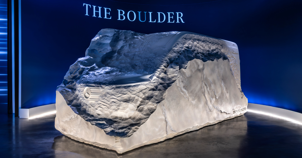 The Boulder представляет собой скульптуру, в которой вырезаны очертания автомобиля. Можно рассмотреть крупную звезду на решетке радиатора, длинный капот и ожидаемо угловатую корму.